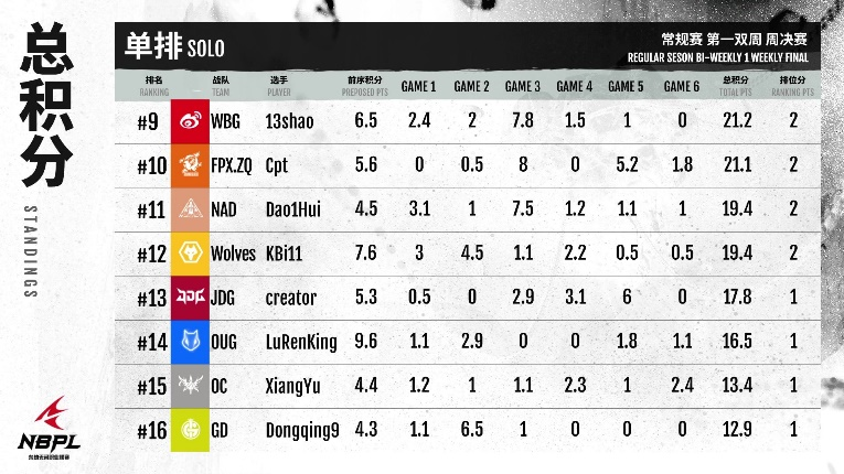 当最后一局开始时,前三名的分差只有0.7,NBPL第一个冠军属于扑朔迷离!