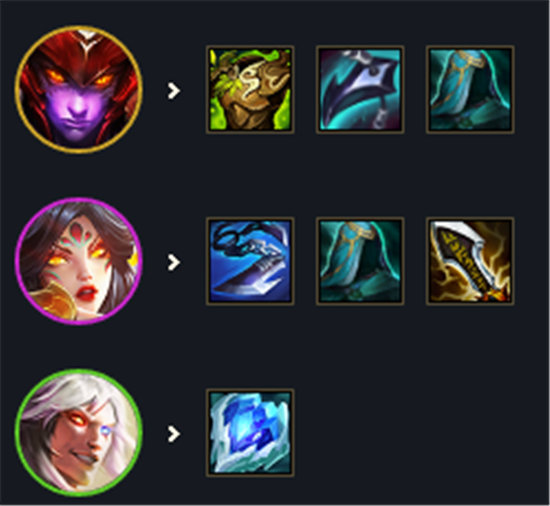 瑟提:羊刀,水银,杀人剑/巨杀/泰坦/无尽霞:巨杀,水银/夜刃,飓风/破甲龙女:狂徒,龙牙,反甲凯隐:冰心。