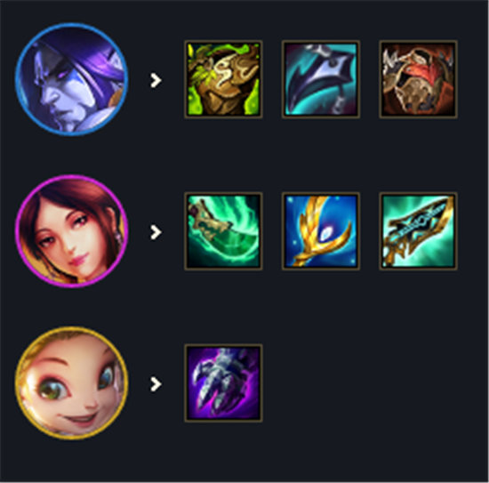 娜美:青龙刀,大天使,电刀/法爆/鬼书。塞拉斯:龙牙,反甲/板甲,狂徒。娑娜/熬兴/索尔:青龙刀,大天使,科技枪/法转。