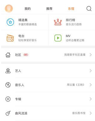 1、首先对于手机中的虾米音乐客户端打开,然后在主页面中找到击乐馆这个功能点击进入。