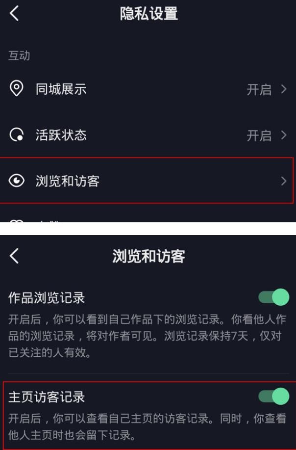 3、点击浏览和访客,关闭【主页访客记录】右侧的开关即可。