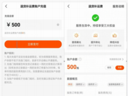 2、开通后,在退货补运费险账号充值页面输入金额,点击立即支付即可。