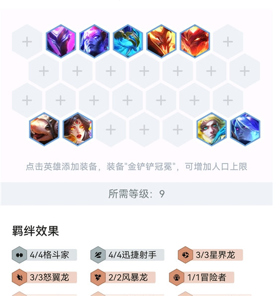 目前热门阵容,强度高发挥稳定,基础配置4斗4游侠,自带1冒险2风暴3星界,9级补人马3怒翼。