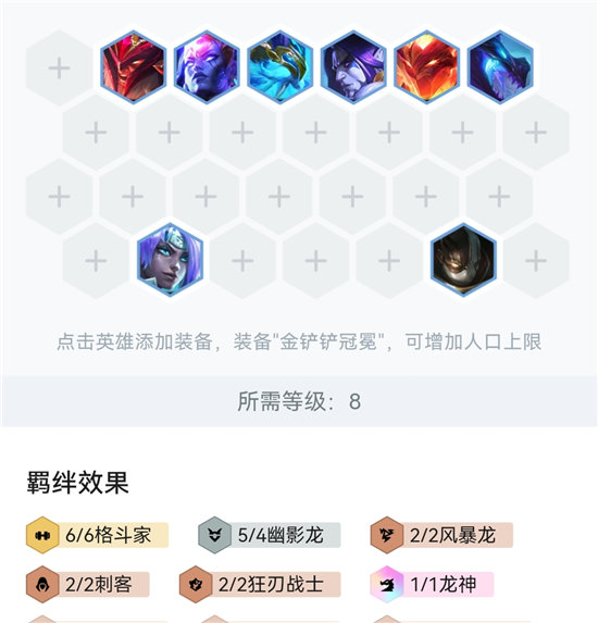 基础配置6斗,自带2狂刃4幽影1龙神,6斗七人口,挂任意四五费就行,有斗士+1开8斗,有幽影开6幽影,都没就挂个琪亚娜开风暴,九级补派克亚索巴德。