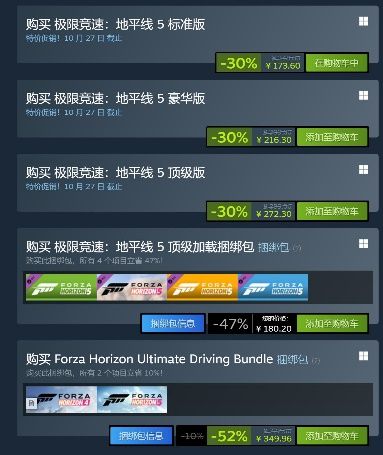 目前Steam平台已经开启全系列游戏折扣。《极限竞速:地平线5》标准版、豪华版、顶级版七折折扣,顶级加载捆绑包更是接近五折。而如果购买包括《极限竞速:地平线》4、5两代终极版的捆绑包,-52%的折扣让你一次体验到两款经典之作!目前十周年庆活动正在火热进行,欢迎加入地平线大家庭!以上就是本次小编带来的最新的游戏新闻资讯分享,想要了解更多的新闻资讯的,欢迎大家关注我们!