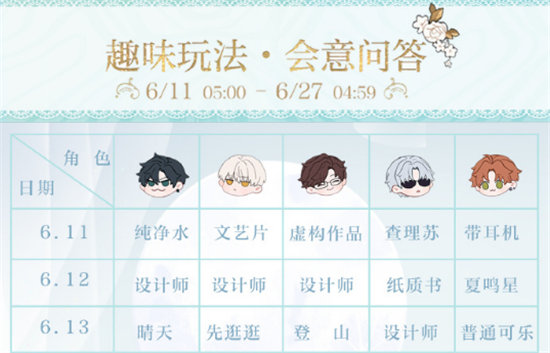 1、6.14会意问答:夏鸣星选A(夏鸣星)更擅长熬夜,萧逸选B(设计师)唱歌更难听,查理苏喜欢A(咖啡),齐司礼选B(设计师)更容易吃醋,陆沉喜欢用A(cd)听歌。