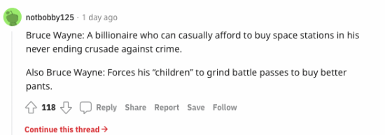 玩家在reddit晒出了一张游戏的界面截图,并称这就像一个手机游戏。也有人在评论区调侃,布鲁斯·韦恩是个亿万富翁,他的“孩子们”却在努力肝通行证来弄更好的装备。目前该作在Steam的评价也仅为褒贬不一。