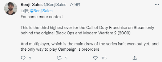 BenjiSales表示《使命召唤19:现代战争2》当前24小时内的同时在线玩家人数是Steam平台上系列历史第三高的成绩,仅次于初代《使命召唤黑色行动》和2009年的《现代战争2》。