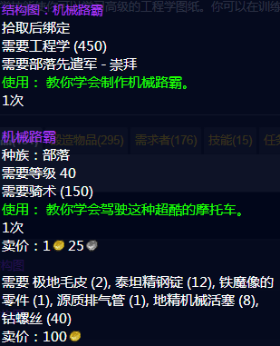 工程学在80级版本又添加了新的制造坐骑,联盟的名为机械师的摩托,部落的名为机械路霸,图纸是由先遣军声望军需官提供,虽然是陆地坐骑,但是机车外观非常炫酷,并且还能额外搭载一名队友,外观和实用性都拉满,是当年无数魔兽玩家梦想中的坐骑,不过该坐骑的制作材料必须要从NPC处购买,成本价就需要12500G。
