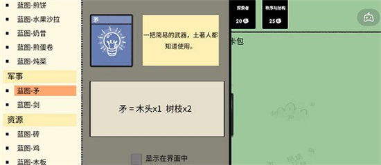1.首先我们先使用木头和树枝合成长矛,然后将农民放置到长矛上生成民兵。(点击查看合成表)