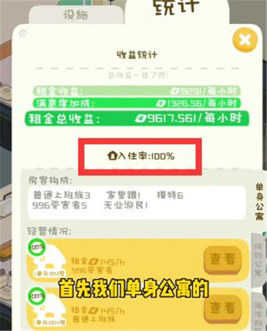 1、第一步:首先我们需要先将单身公寓招募租户,当入住率达到100%以后才能进行新区域的解锁。
