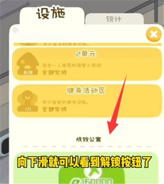 3、第三步:我们滑动到最底部,可以解锁新的区域建筑——成双公寓。
