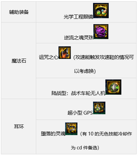这样伤害还会再高一些,但是也相应多了12%的被破招增伤的副作用,不过因为女柔道破韧能力很强,所以之前的副本里破韧之后控制是没有破招的,所以这里还是建议带无人机右槽或者宠物右槽。图中两个搭配都是cd件较多的配置,因为无论是机械战神还是军团本cd都有很重要的作用,在达到攻速的情况下可以根据自身习惯换成表格中其他的装备增加伤害减少cd。有几件装备的选择在这里说明下,低血肩膀是改版后最强的强散装备,但是因为副作用和腰带冲突,虽然极限状态下也可以满足腰带肩膀同时触发,但是需要基本全程不被打所以这里选择了出血肩。伤害会低一些,但是副作用也小了很多。
